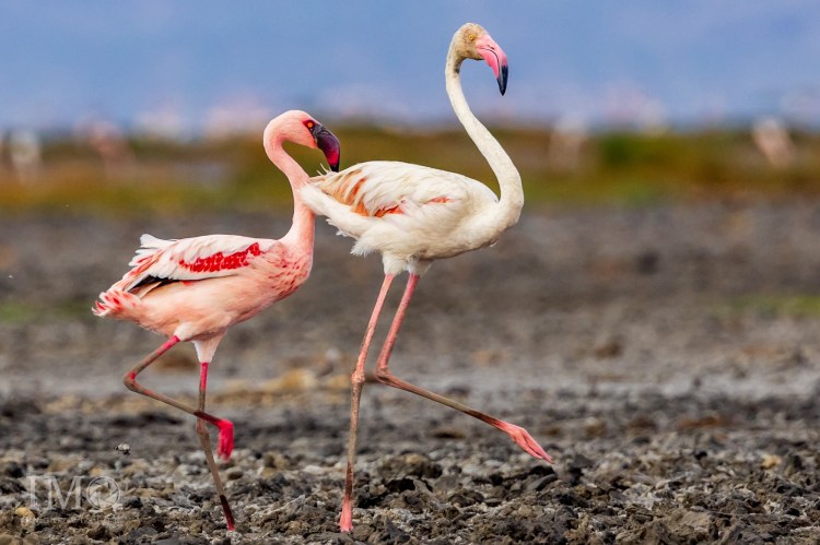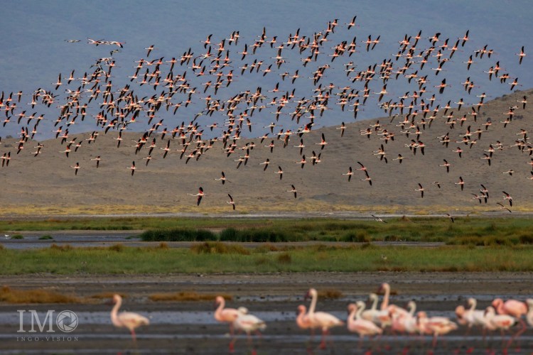 Like most visitors, we came to lake Natron to see lots of flamingos and the experience was fantastic. Fortunately, plans for a factory at the lake were not realized and lake Natron remains a perfect place for flamingos. October is a good time of the year to see them as they are breeding during this time and as the weather is good. Most flamingos at the lake are Lesser Flamingos, but there are also Greater Flamingos. The difference can be seen well in the photo below: